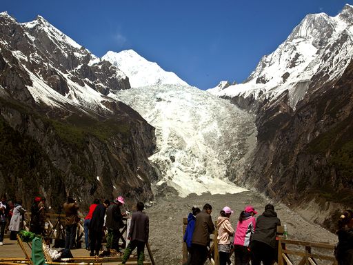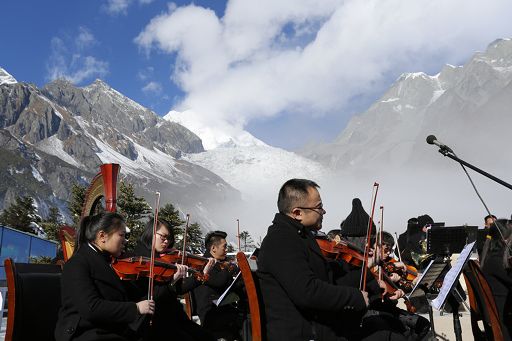 四號(hào)營地,晴空萬里、風(fēng)和日麗,清澈的高原天空藍(lán)得澄明醉人,來自四川交響樂團(tuán)和民間的200多位樂手共同在海拔3500米的冰川瀑布之下演奏了《青藏高原》、《向往神鷹》、《菊花臺(tái)》等歌曲。