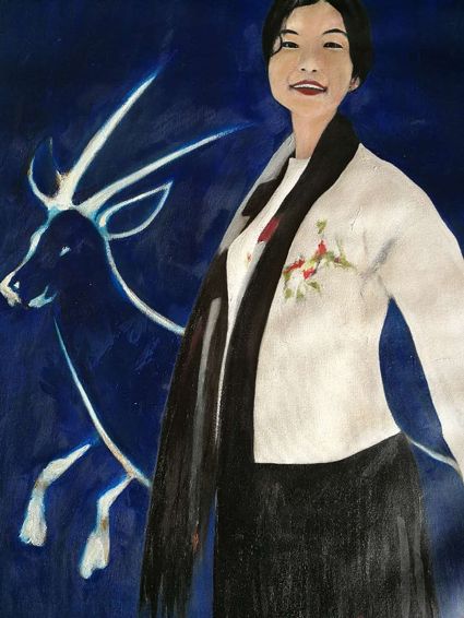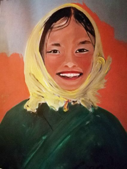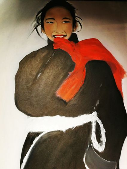 畫(huà)畫(huà)三年多了。十三歲寫(xiě)詩(shī);到了高原后,方開(kāi)始創(chuàng)作長(zhǎng)篇小說(shuō)。在上海,我做過(guò)畫(huà)廊。但要說(shuō)斗膽動(dòng)筆畫(huà)幅肖像。我是在白度母唐卡前燃了三炷香的。包括在咖啡店現(xiàn)場(chǎng)作畫(huà)。到京城繼而國(guó)外辦畫(huà)展,我認(rèn)為都是因了我把畫(huà)布當(dāng)成了詩(shī)稿的緣故。于是,大家喜歡我這種野路子,天馬行空,可又不舍方圓的創(chuàng)作手法。接下來(lái),歐洲、東京還會(huì)有我的系列展覽。