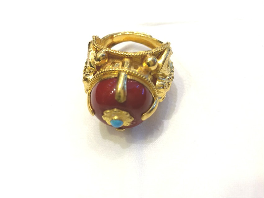蜜蠟是藏家裝飾中的上成品,藏民族對(duì)蜜蠟的喜愛是非常誠(chéng)懇的,表達(dá)著他們對(duì)大自然的無(wú)限崇敬之情與大自然饋贈(zèng)的感謝之情。在他們看來(lái),蜜蠟除了能夠作裝飾品佩戴、收藏之外,最引人注目的就是靈性修行之功效,設(shè)計(jì)師在此款戒指的設(shè)計(jì)上,緊扣藏民對(duì)蜜蠟的喜愛,并將漢式花邊與蜜蠟結(jié)合,是對(duì)藏漢文化交流較好的體現(xiàn)。