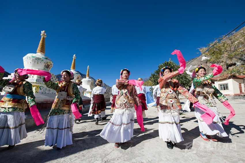 拋開撲朔迷離的傳說,世代居住在康巴南端的得榮人,在勞作之余、逢年過節(jié)、婚姻嫁娶等時機,總會有歌舞伴隨,婦孺老幼都十分喜愛唱歌跳舞,積極踴躍參加,男女青年大都具有吹拉彈唱的本領,在長期的生活中孕育了別具一格的民間歌舞“學羌”,口口相傳、代代融新也是情理之中的事。