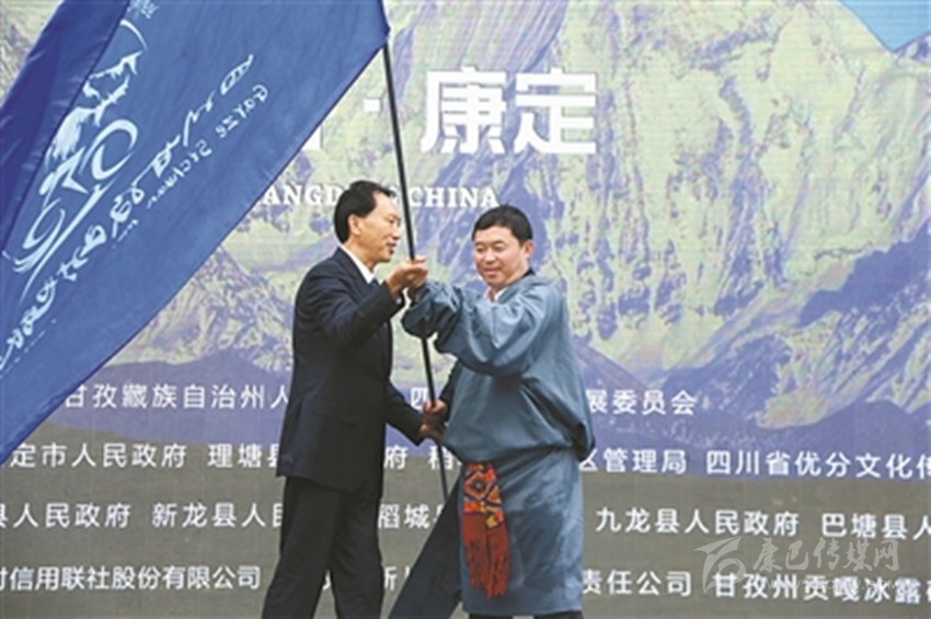 州委副書記、州政府州長(zhǎng)肖友才向下一屆四川甘孜山地旅游節(jié)舉辦地丹巴縣交接會(huì)旗。 余秋林 記者 肖宵 攝
