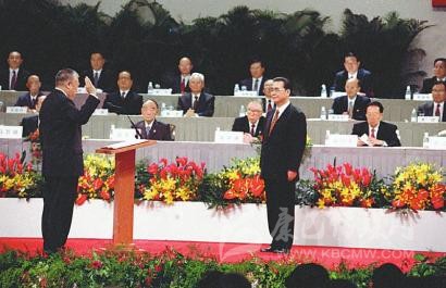 1997年7月1日凌晨,中華人民共和國(guó)香港特別行政區(qū)成立暨特區(qū)政府宣誓就職儀式在香港會(huì)議展覽中心新翼七樓隆重舉行。香港特區(qū)首任行政長(zhǎng)官董建華宣誓就職,李鵬同志監(jiān)誓。 新華社記者 劉建國(guó) 攝
