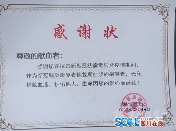 “出院的時(shí)候,我特地與我的主治醫(yī)生說,有相關(guān)的血液捐贈或者其他配合的需求請隨時(shí)聯(lián)系我!”35歲的捐獻(xiàn)者李某表示,這是我首次獻(xiàn)血,我是湖北武漢人,有親戚朋友在成都,當(dāng)作成都是第二故鄉(xiāng),我是1月22日到成都探親,23日下午發(fā)熱在成都市公共衛(wèi)生臨床醫(yī)療中心確診和治療,2月6日出院。在出院治療期間,李某表示,最難忘的就是每次醫(yī)生來查房,都會鼓勵(lì)我說,放心你一定會康復(fù)的,“我難忘成都這份恩情!”