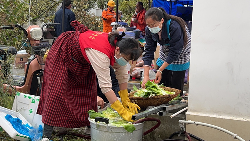 圖為志愿者在洗菜。
