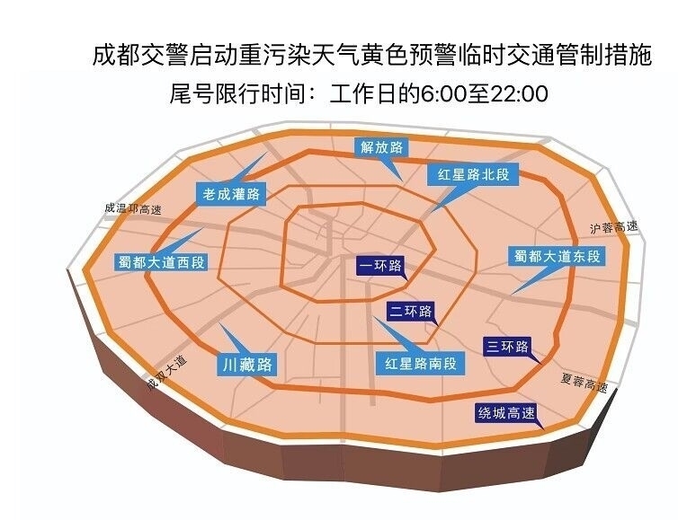 二、工作日的6:00至22:00,禁止國Ⅲ(不含)以下排放標(biāo)準(zhǔn)的汽油車和國Ⅲ(含)以下排放標(biāo)準(zhǔn)的柴油車(特殊車輛除外)在四環(huán)路(成都繞城高速公路G4202,不含)以內(nèi)道路上行駛。