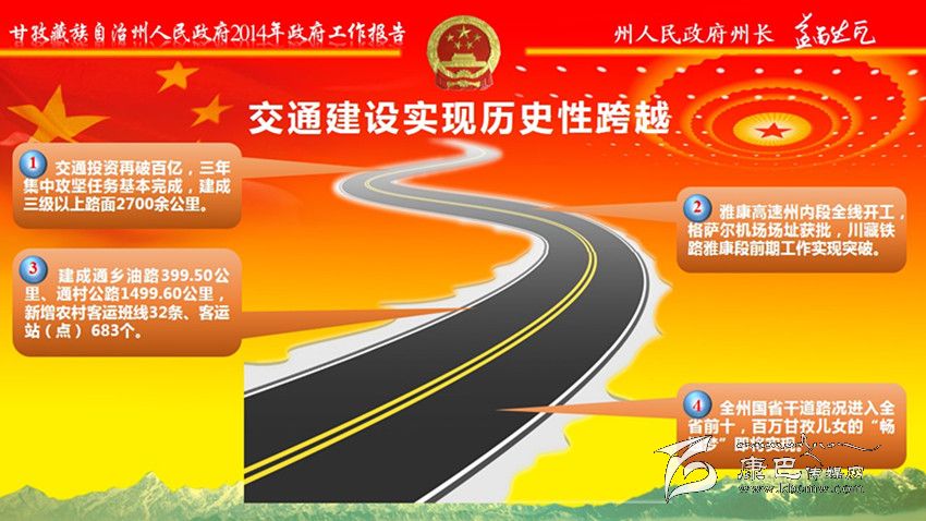 交通建設(shè)實現(xiàn)歷史性跨越。交通投資再破百億,建成三級以上路面2700余公里。雅康高速州內(nèi)段全線開工,格薩爾機場場址獲批,川藏鐵路雅康段前期工作實現(xiàn)突破。建成通鄉(xiāng)油路399.5公里、通村公路1499.6公里,新增農(nóng)村客運班線32條、客運站(點) 683個。全州國省干道路況進入全省前十。徹底告別無電鄉(xiāng)歷史。完成投資100億元,“電力天路”等項目順利實施,“川藏聯(lián)網(wǎng)” 工程提前半年建成投運;18個縣實現(xiàn)與主網(wǎng)連網(wǎng);“遠村點亮”全面完成。城鄉(xiāng)面貌煥然一新。堅持建好縣城,全州市政基礎(chǔ)設(shè)施有效提升。堅持做大集鎮(zhèn),改造小城鎮(zhèn)危舊房1118戶;投入1.34億元完善姑咱、馬尼干戈、香格里拉、八美4個省級“百鎮(zhèn)試點”鎮(zhèn)市政設(shè)施,13個鄉(xiāng)獲準撤鄉(xiāng)建鎮(zhèn)。堅持做美村寨,成功創(chuàng)建45個省級“美麗鄉(xiāng)村”示范村,19個州級幸福美麗新村試點建設(shè)全面啟動,打造新村聚居點235個,建成藏區(qū)新居1.11萬戶。全州城鎮(zhèn)化率達到27%。通信覆蓋越來越廣。完成投資4.53億元,國省干線和主要旅游景區(qū)通信網(wǎng)絡(luò)實現(xiàn)連續(xù)覆蓋。生態(tài)底色更加鮮明。編制完成《甘孜州生態(tài)文明建設(shè)規(guī)劃》,落實國家生態(tài)功能區(qū)轉(zhuǎn)移支付資金6.8億元,生態(tài)保護與建設(shè)工程加快推進,草原植被、森林覆蓋率分別達到78%、33.04%。