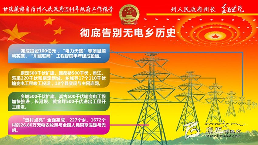 大力推進電力通信建設(shè)。投入20億元,加快實施“電力天路”、無電地區(qū)電力建設(shè)新增項目和農(nóng)網(wǎng)改造升級工程,切實緩解邊遠地區(qū)群眾缺電問題;完成長河壩電站500千伏等3個輸變電項目;統(tǒng)籌抓好表后入戶工程,確保群眾安全用電。投入6億元,新建通信光纜2360公里、基站1025個,解決國省干道、旅游景區(qū)景點信號盲區(qū);新增30個自然村通電話、545個行政村通寬帶,出口總帶寬達到82G。
